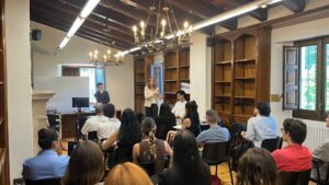 Ese mismo día, los y las opositoras a la Carrera Diplomática iniciaron su camino en el CEI. En esta sesión contamos con el testimonio de Marcos Sebares, Alumni CEI y actual Jefe de Área de la Dirección General de Política Exterior y Seguridad en el MAEC, quien compartió su experiencia en el centro y su trayectoria profesional como diplomático. También participaron el Embajador Perpiñá Robert y el profesorado de idiomas: Kathryn O’Connor (inglés) y Olivier Vinsonneau (francés). A lo largo de la sesión explicaron el proceso selectivo y el papel del CEI durante la fase de oposición.